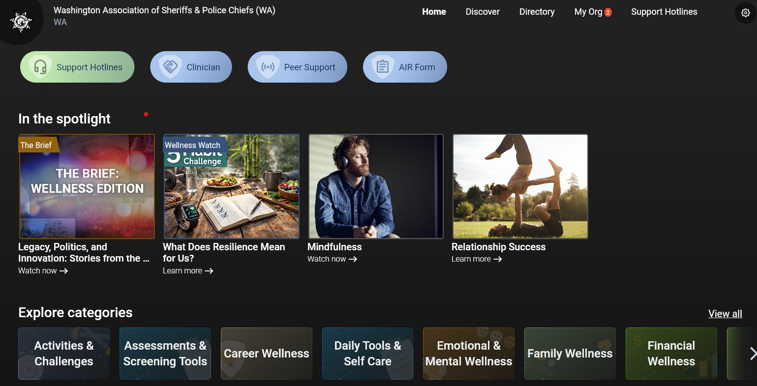 The Washington State Legislature has allocated funding to the Washington Association of Sheriffs and Police Chiefs (WASPC) to establish and coordinate an online or mobile-based application (app) for any Washington law enforcement officer; 911 operator or dispatcher; and any other current or retired employee of a Washington law enforcement agency; and their families, to anonymously access on-demand wellness techniques, suicide prevention, resilience, physical fitness, nutrition, and any other behavioral health and wellness supports.